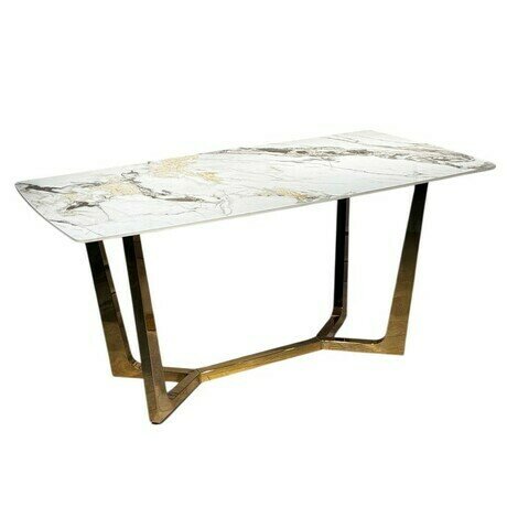 Обеденный стол из керамогранита – лучшая альтернатива натуральному камню. Размер: 160х90х75 см. Столешница: керамогрантит с глянцевой поверхностью. Цвет: белая керамика (Пандора) Подстолье: нержавеющая сталь с глянцевым золотым покрытием.