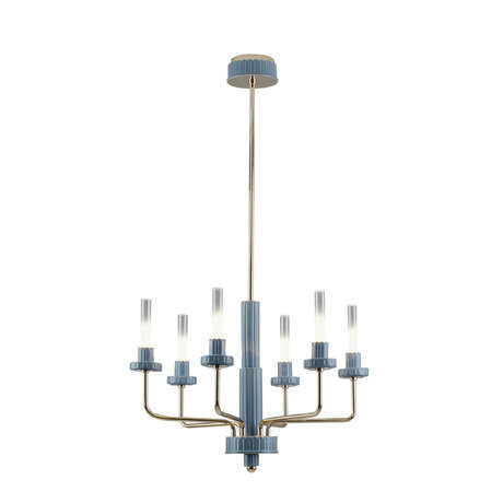 Светодиодная подвесная люстра Atelieri V11692-PL с керамическим декором. Дизайн и материалы Подвесная люстра Atelieri-это гармоничное сочетание современных форм и декоративной выразительности. Шесть вытянутых цилиндрических плафонов из прозрачного стекла создают визуальную лёгкость, а аккуратные декоративные элементы из керамики в голубом оттенке придают светильнику характерный акцент. Металлический корпус с благородным золотым покрытием подчёркивает элегантность дизайна и делает люстру уместной в самых разных интерьерах -от минимализма до неоклассики.